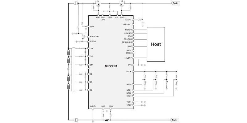 MP2793 具有高达 50mA 的内部电池均衡功能,支持 7 - 16 节电池包监测及全方位保护,支持 FET 软启动放电控制以消除预充电电路,其双 ADC 架构可实现严格同步的电流/电压测量,用于测量阻抗。MP2793 可与MP4278X 配合使用,后者可兼容任何 AFE 实现精准的电量预估,支持 2s 到 16s 电芯(最高支持 112s 版本),可对每节电芯实现 SOC计算以及整个 PACK SOC 计算,提升 SOH、SOC、峰值功率、电池内阻的估算精度。