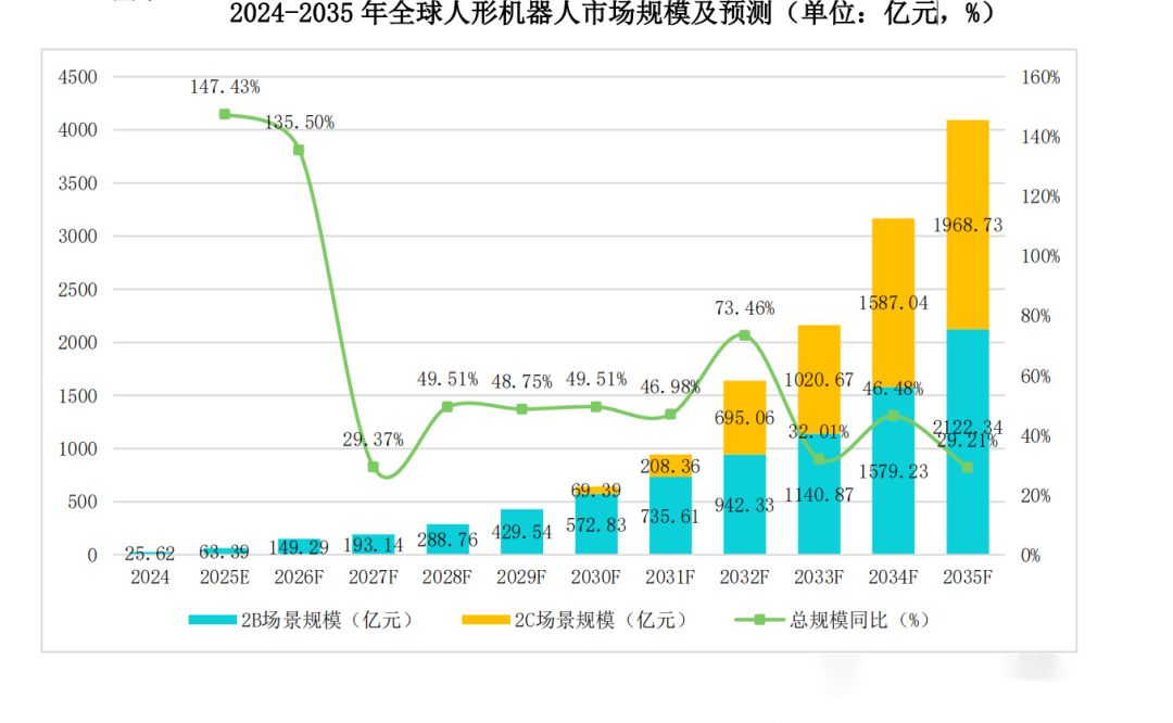 根据 GGII 发布的《2025 年人形机器人产业发展蓝皮书》,2025 年全球人形机器人市场销量预计达到 1.24 万台,市场规模达 63.39 亿元;到 2035 年,这一数字将飙升至 500 万台以上,市场规模突破 4000 亿元。