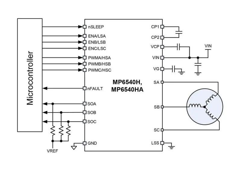 MP6540H 为 3 相直流无刷电机驱动器,集成了由 6 个 N - 沟道功率 MOSFET 组成的三个半桥、预驱动器、栅极驱动电源和电流采样放大器。该器件可提供高达 6A 的峰值电流和 5A 连续输出电流,使用内部电荷泵为上管 MOSFET 生成栅极驱动电源电压,并采用涓流充电电路维持足够的栅极驱动电压,以实现 100%占空比操作。该器件采用QFN-26(5mmx5mm)封装。