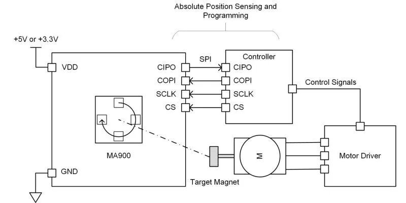 MA900 可为灵巧手的关节电机提供高精度的位置检测,其角度数据从传感器 IC 上多个位置的磁场差异中提取,这种差分法消除了寄生磁场的影响,对超过 4kA/m DC 或 5mT 的寄生杂散磁场不敏感,可提供零滞后的结果输出。MA900 通过片上非易失性存储器(NVM)存储设置参数,如参考零角度位置、ABZ 编码器设置和 UVW 仿真配置,其中 ABZ 正交编码器接口可配置每圈脉冲数(PPT),UVW 接口支持 1 到 8 极对仿真。该器件采用 QFN- 16(3mmx3mm)封装。