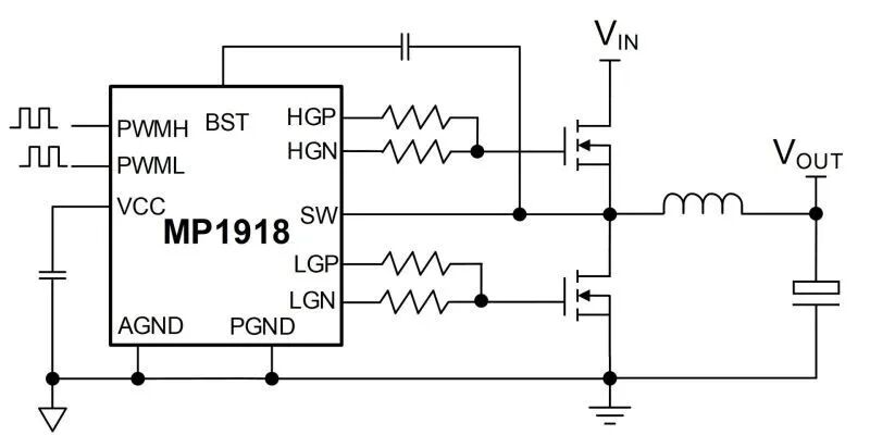 MP1918 用于在半桥或同步应用中驱动具有低栅极阈值电压的增强型氮化镓(GaN)FET 或 N 通道 MOSFET。其工作电压范围为 3.7V 至 5.5V VCC,提供独立的上管(HS)和下管(LS)TTL 输入以及两个独立栅极输出,可实现可调导通 / 关断功能。MP1918的Sink/Source 电流能力出色,分别达到 1.6A 和 5A,能够更好地匹配负载以维持驱动信号稳定。该器件采用侧面镀锡的 QFN - 14(3mmx3mm)封装。
