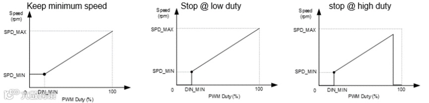 在控制方面,MPQ6653A支持 50Hz-100kHz 的 PWM 信号或者 0-3V 的直流信号控制电机转速,提供了开环控制和闭环控制两种模式。无需外置 MCU 及 PWM 控制芯片,即可实现精准控制转速。此外,MPQ6653A还提供了四个编程点,实现多样的曲线编程功能。在此基础上还可根据应用场合的需求,设置高/低输入信号下的风扇起停功能。