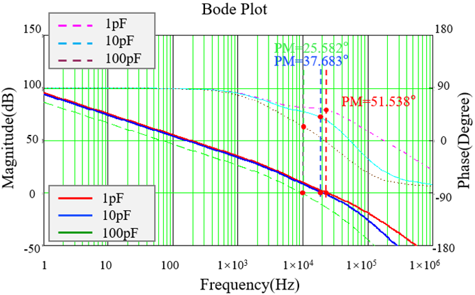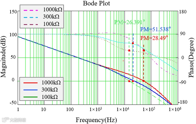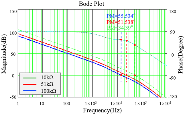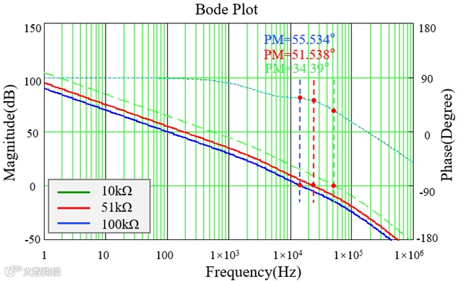 随着两者阻值之和的增大,系统的增益减小,根据得到的伯德图6可以看出,整个幅频曲线下移,系统的截止频率减小,相角裕度会相应增大。在实际应用中,上分压电阻受到于输出分压比例的限制。