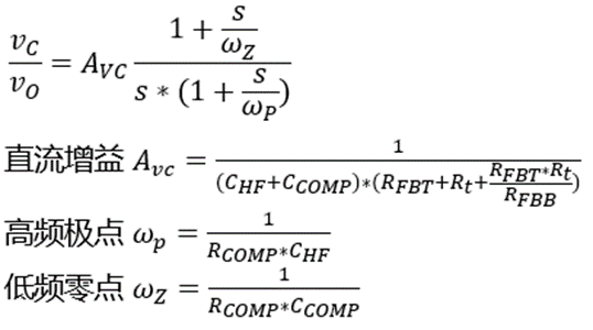 绿色框圈出的则是系统的反馈及补偿环节,该部分主要包括反馈分压电阻、Rt电阻以及补偿网络,其中补偿网络顾名思义就是通过引入额外的零极点来补偿环路的不足,从而实现更优的动态和稳态性能。同样推导出整个环节对应的传递函数及主要变量的关系式: