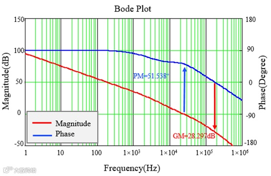 由于伯德图在推导及绘制时已将相频特性曲线整体抬升180°,故蓝色的相频特性曲线在截止频率下距离0°线的距离,即为系统的相位裕度。通过伯德图可以看出其相角裕度和幅值裕度均能满足环路稳定性的需求。