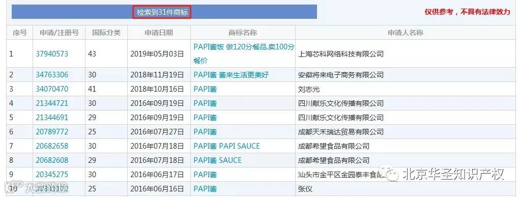 所以,经“papi酱”授权,由泰洋川禾文化传媒徐州有限公司在多个商标类别上申请注册的“papi酱”系列商标,被商标评审委员会驳回,理由是“与其他商标构成近似”。果然,在国家商标局官网查询到,“papi酱”系列商标不止被一家抢注。