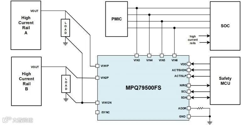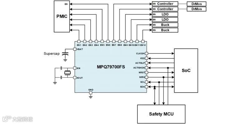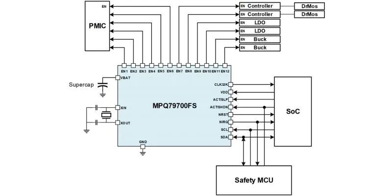 一个自动驾驶系统庞大,除了主芯片核心供电之外,还有很多外设,I/O口等都需要供电,这些供电往往需要独立的小电源来供电,而这些小电源的上下电时序以及功能安全设计,独立的小电源自己无法满足。针对这个需求,MPS推出了MPQ79500和MPQ79700两款能够支持汽车安全等级 ASIL-D级芯片,帮助复杂系统轻松实现的功能安全系统设计。