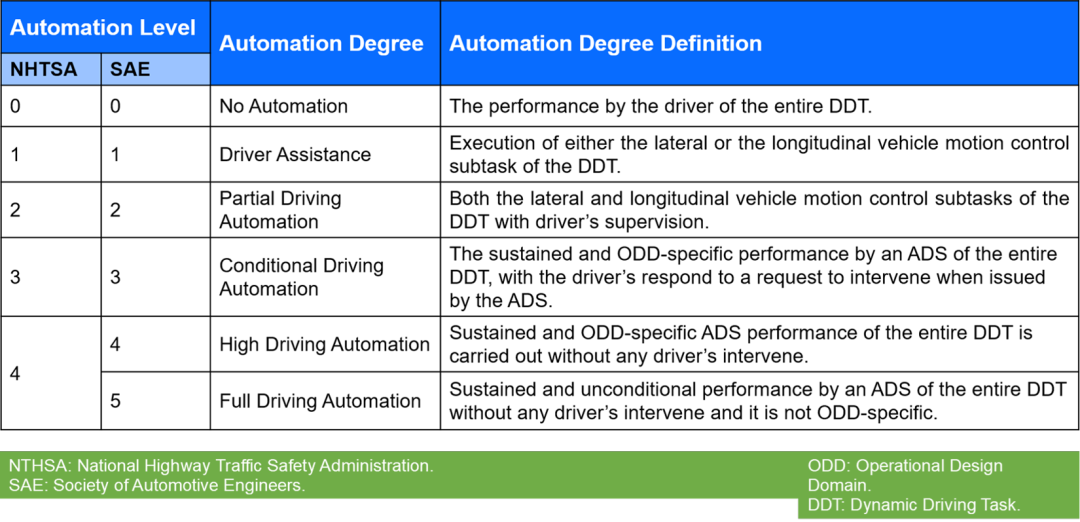 自动驾驶汽车(Autonomous Vehicle),是指一种通过传感器和运算单元实现无人驾驶的智能汽车,其核心硬件模块包括电子控制单元(ECU, Electronic Control Unit)/域控制器(DCU, Driving Control Unit)和传感器(感知元件)两大部分。根据美国汽车工程师协会(SAE)发布的SAEJ3026标准和2021年8月中国出台的《汽车驾驶自动化分级》国家标准,自动驾驶被分为L0至L5 六个等级,从L0级应急辅助驾驶到L5级完全自动驾驶,如下图所示: