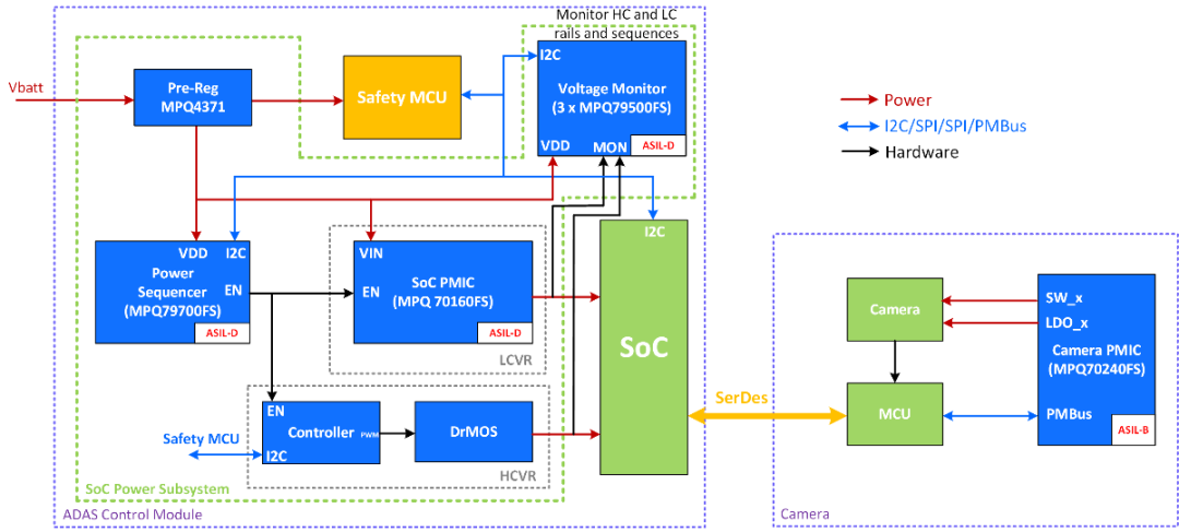 图6展示了一个为自动驾驶平台计算中心供电的顶层架构。该架构为符合 ASIL-D 标准的智能自动驾驶平台供电与监控平台。整个架构大体分为SoC供电模块,摄像供电模块两部分。MPS提出的解决方案通过采用MPSafeTM开发流程,在保证功能安全的基础上,同时能帮助用户实现高效、快捷和成本可控。