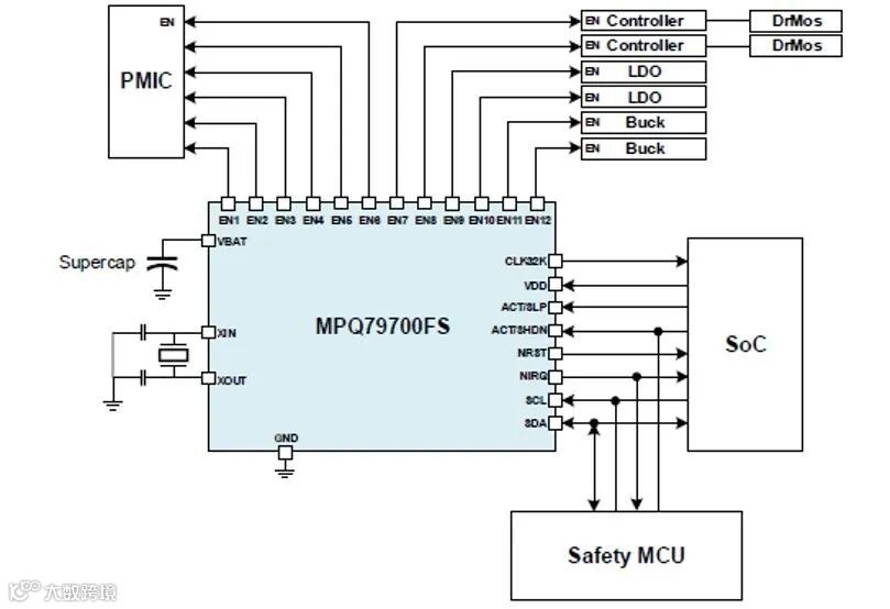 MPQ79700FS 是一款专为汽车高级驾驶辅助系统 (ADAS) 和自动驾驶平台设计的 12 通道功能安全电源时序芯片,可为需要多个电源轨道供电的SoC提供必要的上下电时序控制。该设备的可配置性和灵活性支持跨不同的设计应用。用户可通过I²C对12个通道进行独立配置每个通道的拉高拉低时序序列。同时,12个通道中的四个还可以被设置为GPIO,以满足用户的额外需求。MPQ79700FS 电源时序芯片包含一个振荡器,通过驱动芯片外部晶体震荡以发出32.768 kHz的时钟信号,以及一个具有报警功能的实时时钟 (RTC)。该芯片还包含可通过 I²C 接口访问的可配置看门狗,低电平有效的系统复位以及中断输出来保证故障监测和报告。