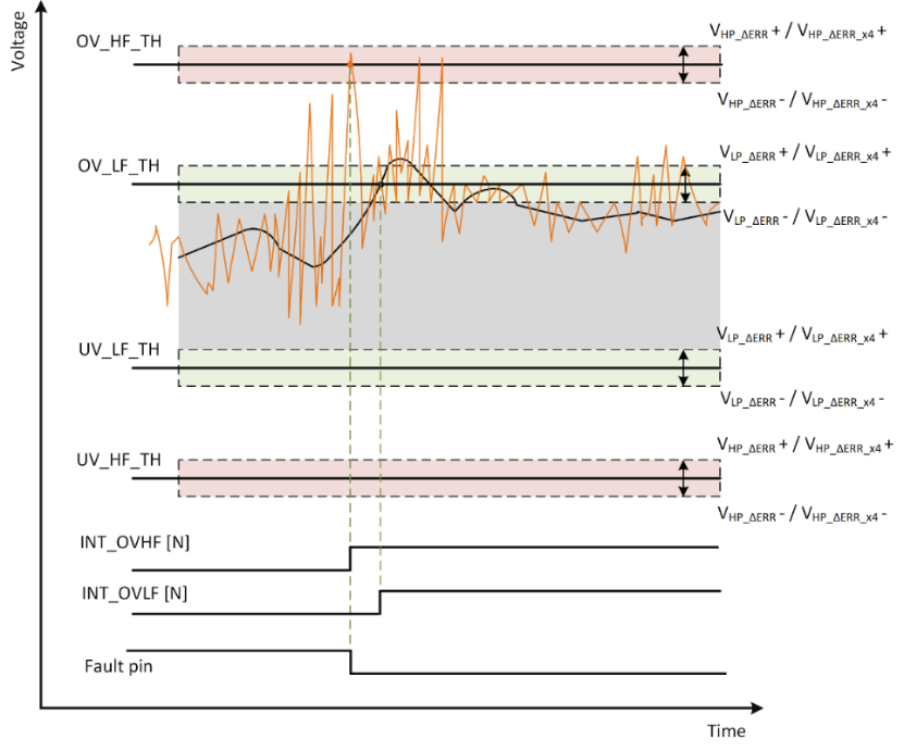 用户可以通过 I²C 来访问并配置OV 和 UV 监控阈值和受监控范围。图6显示了 MPQ79500FS-AEC1 在发生 OVHF 和 OVLF 故障事件时的 OVHF、OVLF、UVHF 和 UVLF 监控以及故障报告和记录。