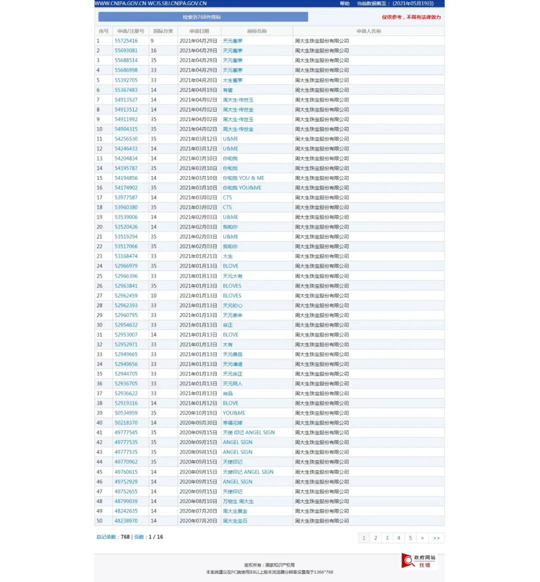 5月20日讯 商标官网显示,近日周大生珠宝股份有限公司同时申请注册了4个“天元酱茅”商标,这4个商标分别涉及酒、广告销售、办公用品、科学仪器四大分类,目前这些商标均处于“申请中”状态。