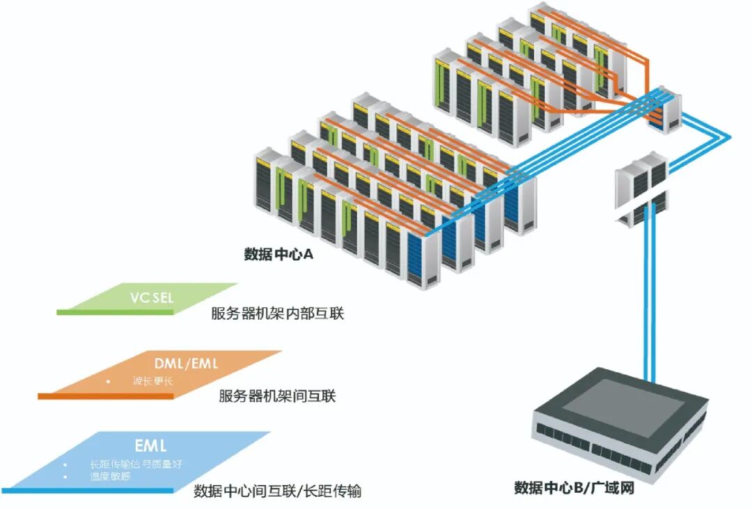 后来,集成了电吸收调制器(EAM)与 DFB 的电吸收调制激光器(EML)应运而生:EML 工作时,给激光器的注入电流保持恒定,依靠外部调制器对光信号进行调制,因此不易产生啁啾效应、信号传输质量较理想,非常适合高速率、远距离的电信骨干网、城域网和数据中心互联类的应用;但是相对地,EML 在价格和功耗层面优势不够明显,因为EML在使用时需要给调制器 EAM 额外提供一个负压偏置,同时还要搭配半导体制冷器(TEC)进行精密的环境温度控制来保证高信号传输质量。