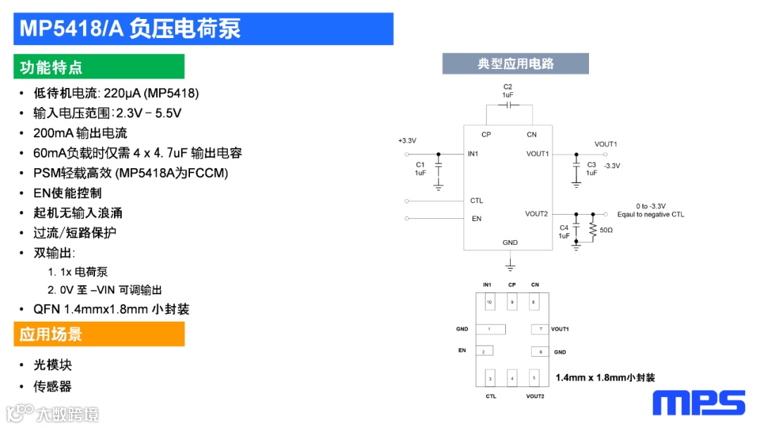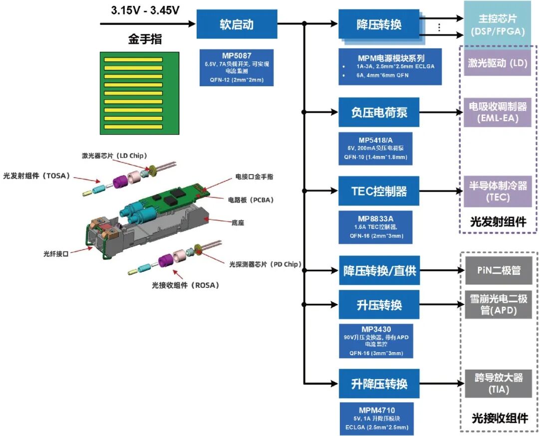 MPS 公司的产品具备小型化、高效率、低纹波的特性,提供从降压与升降压转换电源模块(集成电感)、负压电荷泵、TEC控制器到软启动负载开关的整体解决方案,完美适配高速光模块电源方案设计需求。
