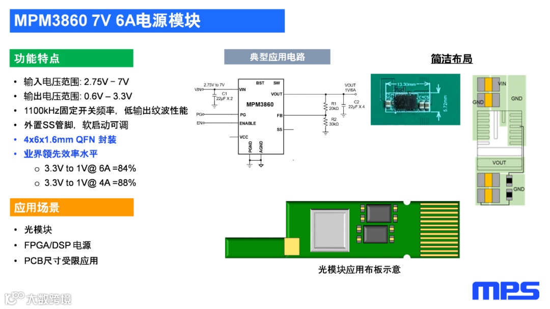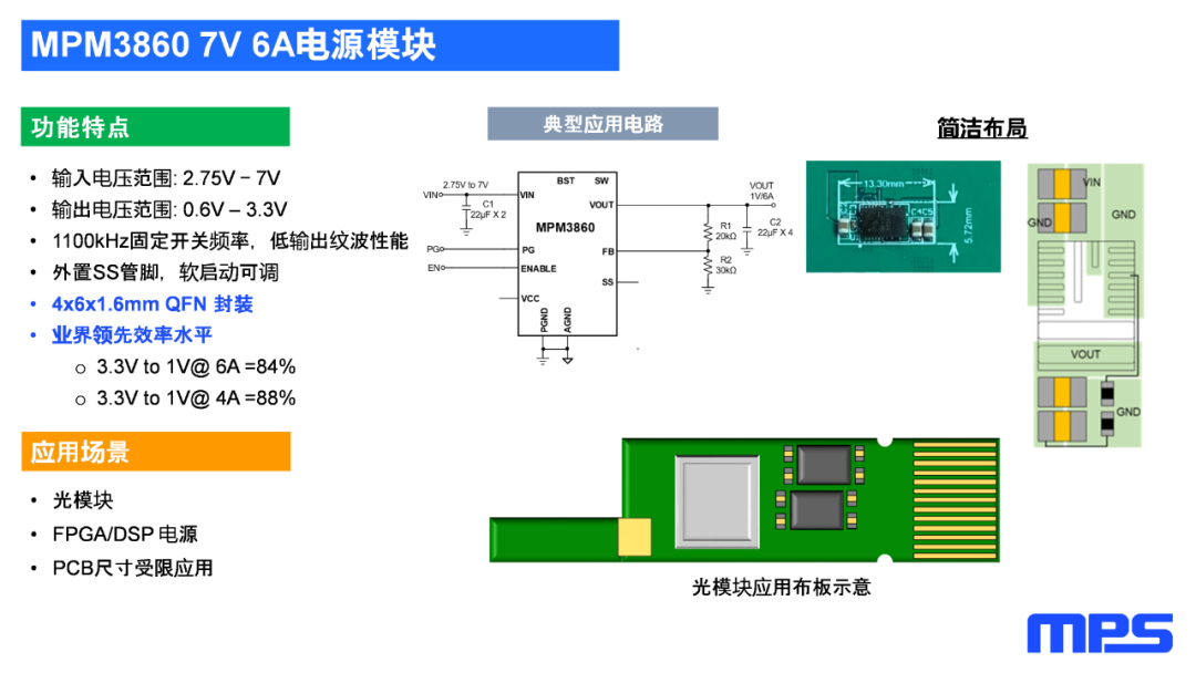 MPM3860 则提供低压档位单路 6A 的高效率电源模块方案,单颗尺寸仅4mm x 6mm: