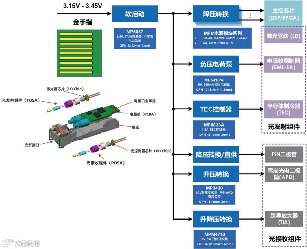 针对目前已在数据通信、光纤骨干网中成规模使用的 400G/200G/100G 光模块,MPS 公司提供相比分立元件方案尺寸更小、效率更好的5V电源模块解决方案,助力产品优化迭代。