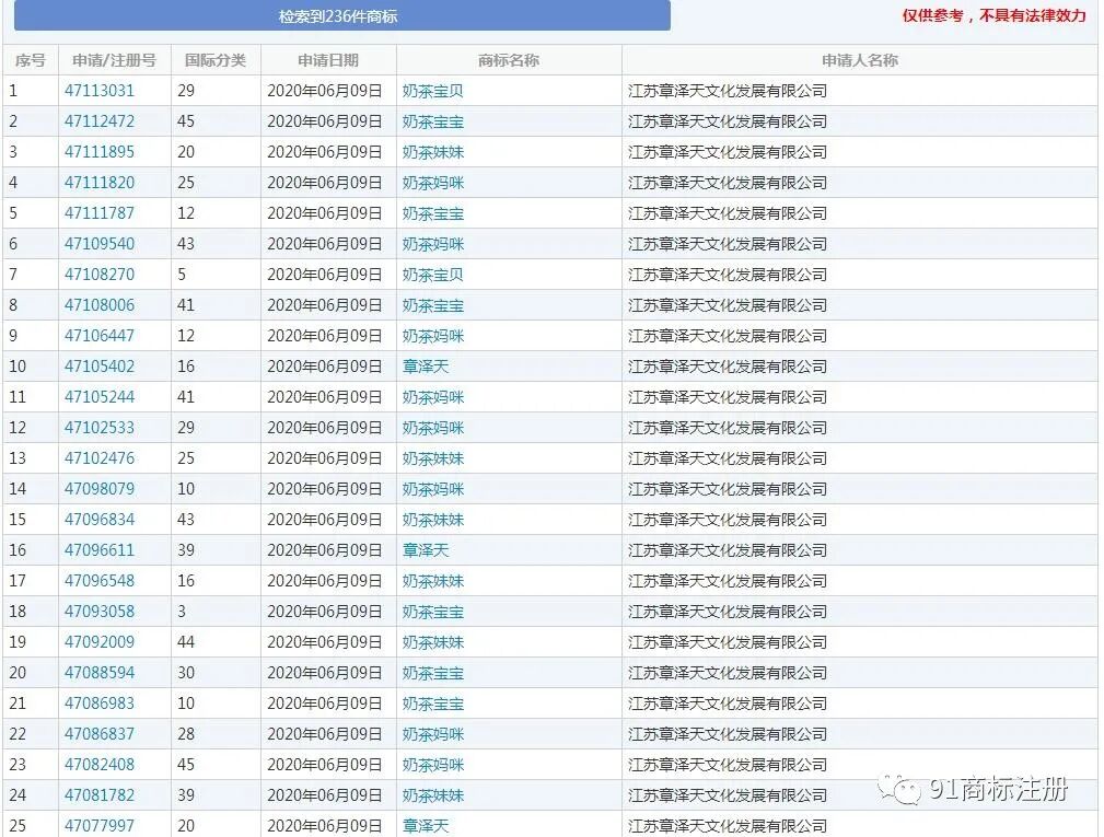 近日,江苏章泽天文化发展有限公司新增多条“奶茶妈咪”“奶茶宝宝”“奶茶宝贝”等商标,商标国际分类涉及日化用品、教育娱乐、餐饮住宿等,申请日期为2020年6月9日,商标状态为等待实质审查。