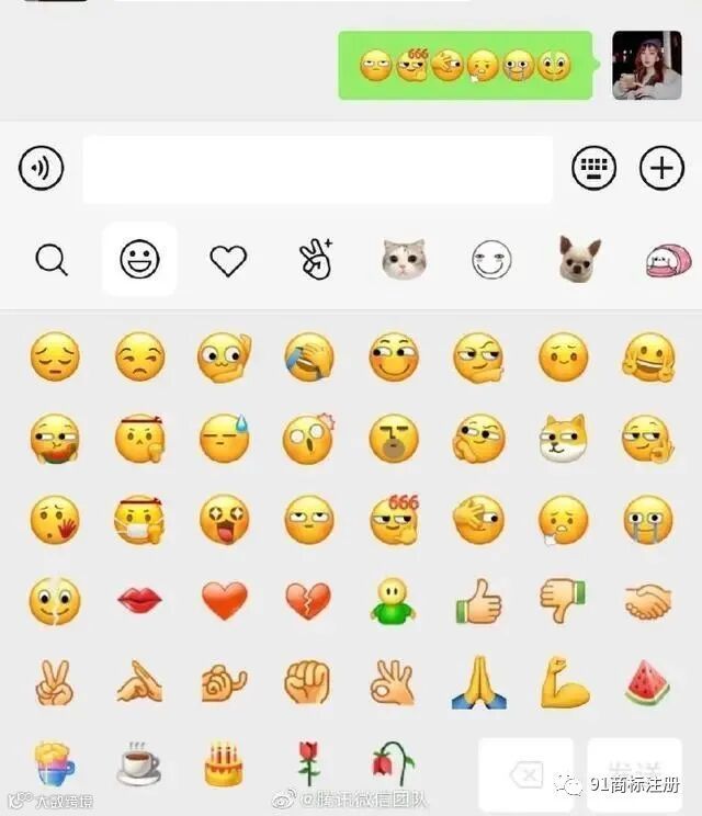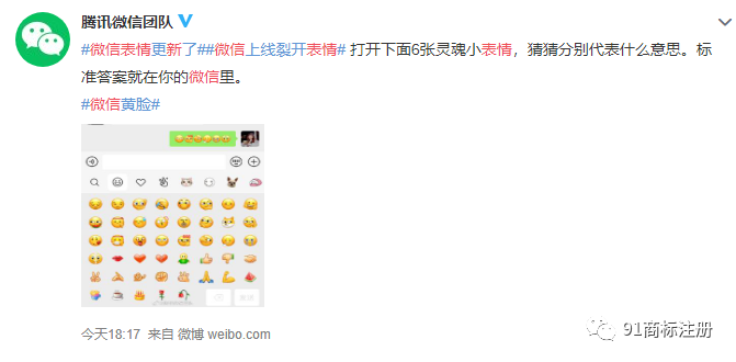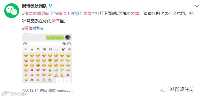 91商标注册11月18日,根据微信官方的消息,微信新增了 6 个小表情。