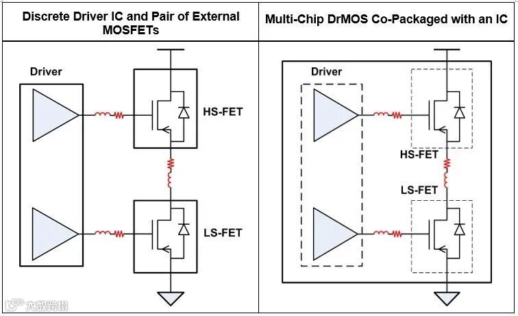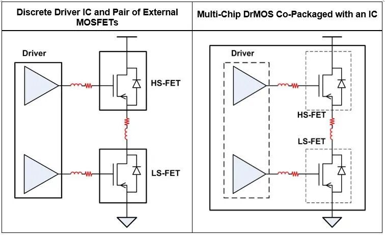 大家都知道AI电源解决方案没有功率级就无法工作,而功率级通常会采用分立式解决方案。 分立式解决方案由驱动器 IC 和一对外部 MOSFET 组成,为三芯片解决方案。还有一种方法是将多芯片驱动器 — MOSFET(DrMOS)共同封装到一个 IC 解决方案中。