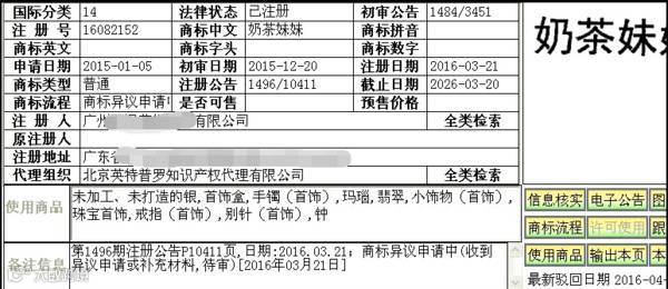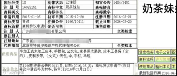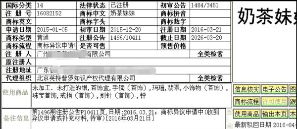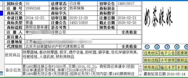 圣哥在商标局的官网上查询了下,“奶茶妹妹”还不止被注册为性爱玩具,服饰、皮具、化妆品、珠宝等类目都已经被注册了。