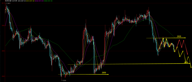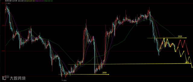 看下盘中,今日欧盘时段银价已经开始了很明显的下跌趋势,现在在2900附近表现出一定的支撑,但从前期走势和图形来看,我们认为晚间美盘时段或还有一波下跌,低位暂时看懂2870附近。投资者操作上可以参考我们的策略轻仓尝试。日内上方关注2935的阻力,下方依次的支撑位是2900-2970-2850。