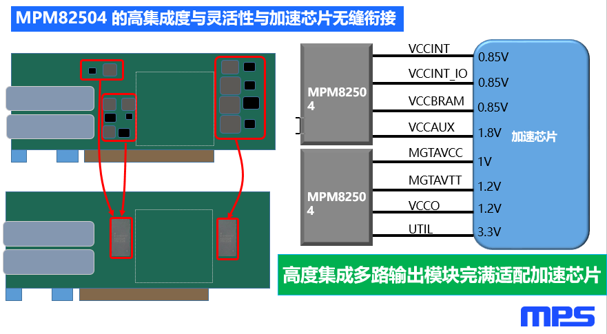 MPS电源模块的高响应速度帮助客户完美解决了各类加速芯片对于输入电压精度的高要求以及由于计算负载切换而产生的大动态电流的矛盾。