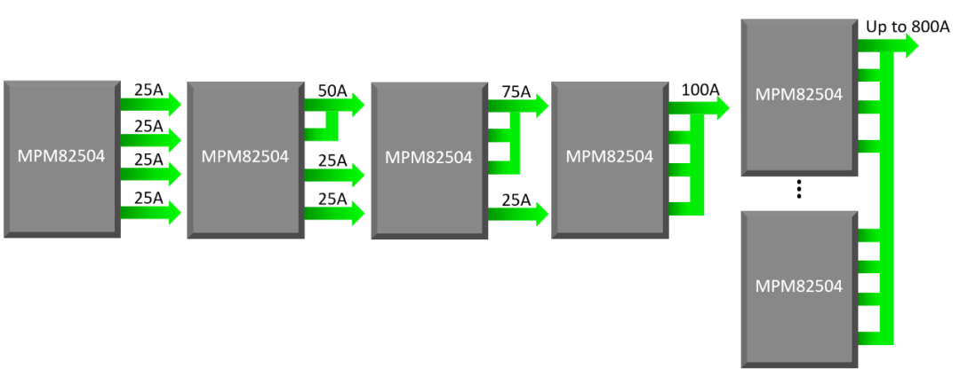 以MPM3695-100 为例,该产品可以由单模块100A输出扩展为:双模块200A,3模块300A, 最多8模块并联800A输出等供电方案,以支持更广泛的系统要求。图5展示了该模块在8模块并联的应用。