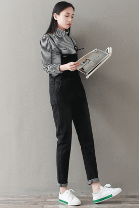 韩国东大门购物Partysu春秋新款休闲裤围嘴女士长裤黑色