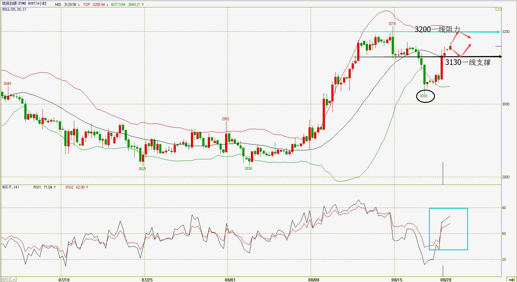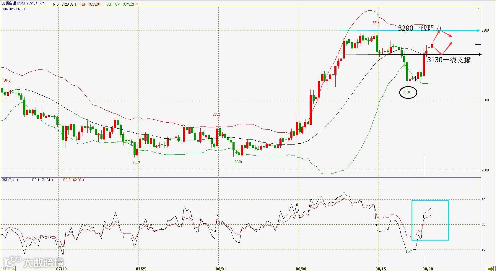 从现货白银的4小时图来看,昨日现货白银大涨,现处在布林带中轨线之上的强势区间,RSI指标也在50之上,短线维持强势,今晨公布的美联储会议纪要偏“鸽派”。投资者可考虑逢低进多,下方关注布林带中轨即3130一线支撑,上方关注3200一线阻力。
