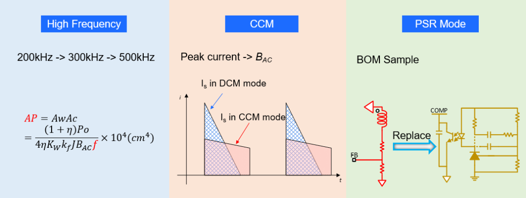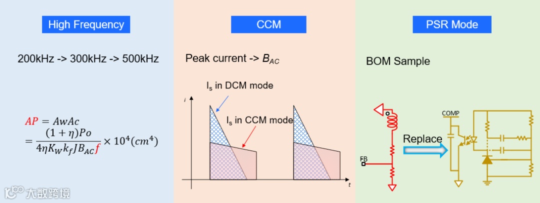 主要针对最为常见的反激电路,可以通过提高开关频率,选择连续工作模式以及采用原边反馈方案,来尽可能的减小电源尺寸。