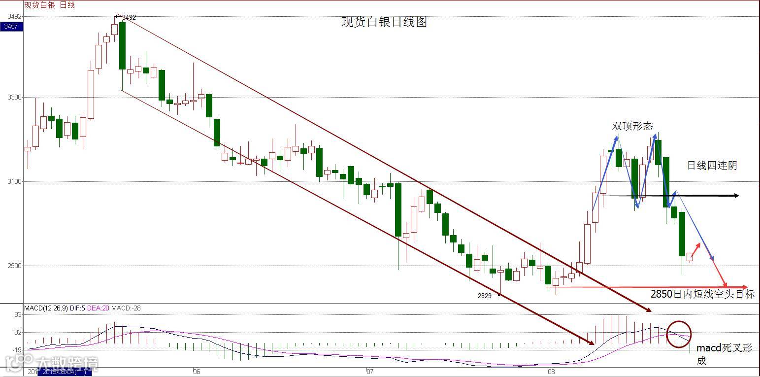 昨日现货白银大阴收盘,弱势明显,今日技术反抽修正仍是高空布局好时机,进场2930、2960,止损30点,止盈2880、2850。