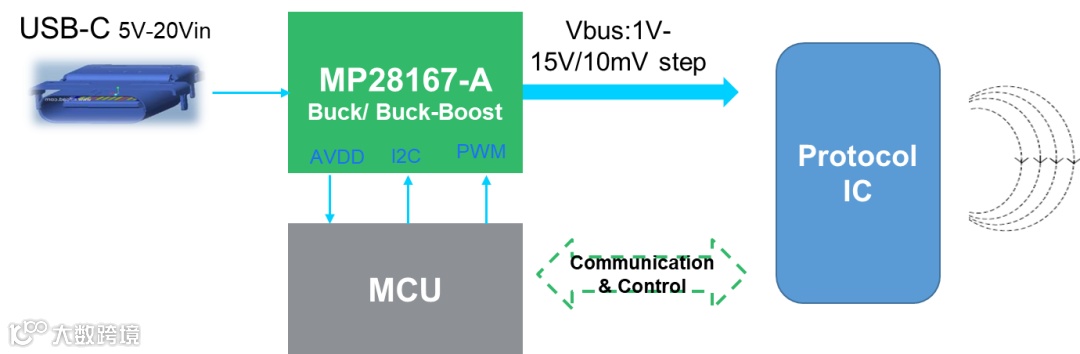 特别要介绍下,MP28167-A 的平均电流限可以在1A-6.5A 范围内在线修改,50mA的步进分辨率,轻松应对PPS设计。也可以通过OC pin脚设置电流保护,丰富了工程师的选择。