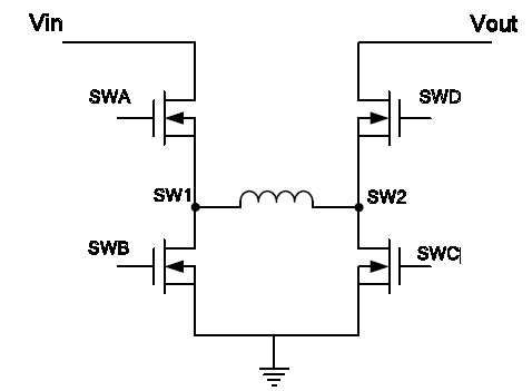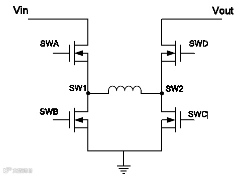 MP28167-A 采用集成四个MOSFET加一个电感的结构,可以在Vin>Vo, Vin=Vo 或者Vin<Vo 的场景下工作。如下图所示,当Vin>Vo时,MP28167-A 工作在降压模式,SWA和SWB开关,SWD保持常开,SWC常关;当Vin<Vo时,工作在升压模式,SWA常开,SWB常关,SWC和SWD开关;当Vin≈Vo时,工作在升降压模式,SWA至SWD同时开关。