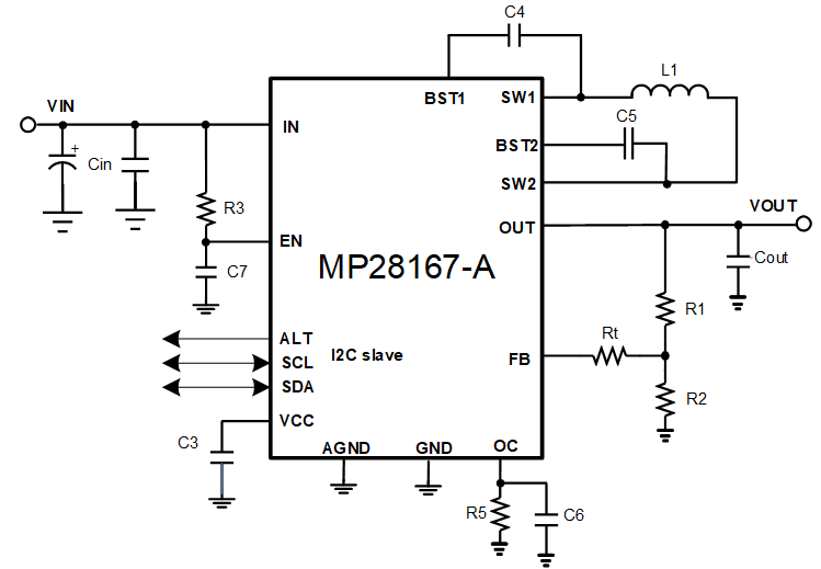 等等,您说您的项目里没有I2C 接口?没关系!MP28167-A同时具有FB 引脚,照样能轻松调整输出电压和输出电流限制。