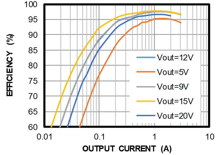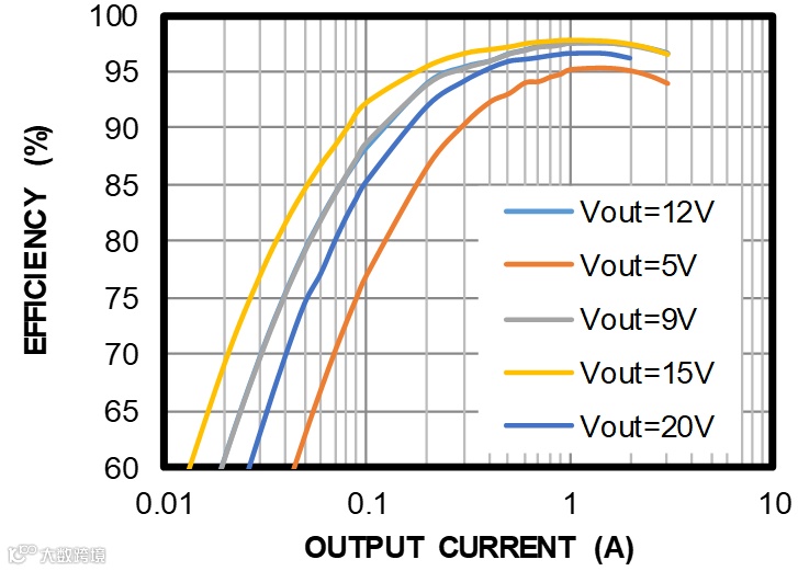 当输入12V,输出电压为9V/1.5A时,效率高达97%,绝对是同类芯片中的佼佼者。