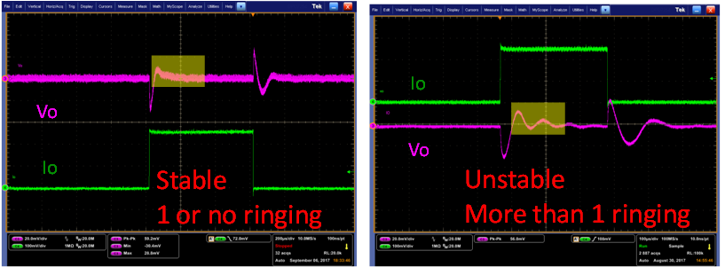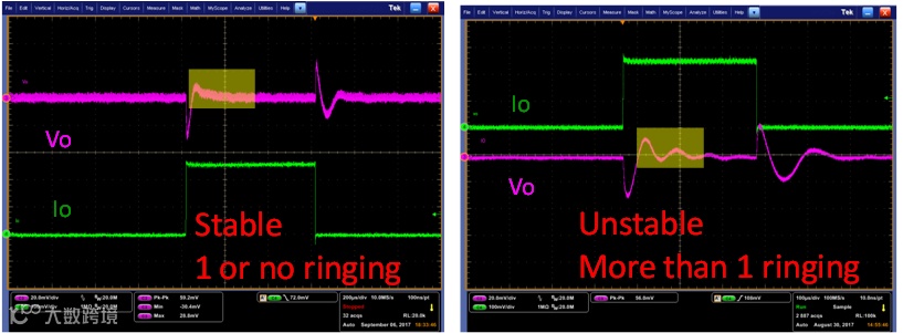 由于前两种COT环路均由比较器组成,可以构建小信号模型但是通过小信号测试仪无法得到闭环传函的波特图,所以无法通过传统方案直接判断其稳定性。我们一般通过其动态响应来判断其是否稳定。