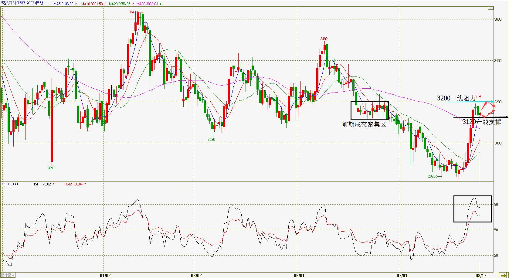 如图为现货白银的日线图,从日线图来看,上周现货白银连续强势反弹,上周五盘中一度突破3200整数关口,后虽大幅回落,但依然收在5日均线之上,目前短周期均线依然呈现出明显的多头排列,RSI指标也在高位运行,上方3200一线阻力较强,预期在美联储会议纪要公布之前,白银将维持高位震荡的走势,投资者可考虑区间操作,上方关注3200整数关口阻力,下方关注3120一线支撑。