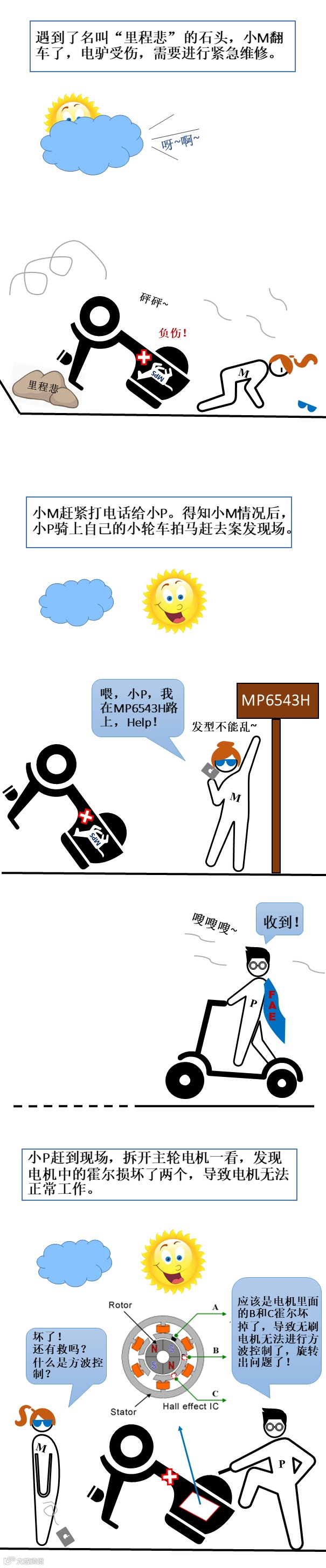 注:骑电动车一定要带好头盔哦!小M在漫画中的做法切勿仿效。