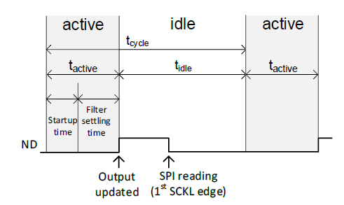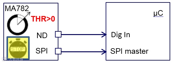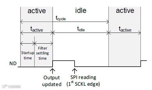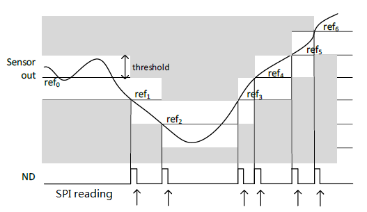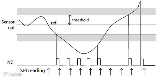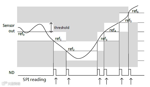 图注:固定参考唤醒模式 --- 角度变化超过阈值产生ND信号,ND将保持高电平直到下一个SPI角度读取