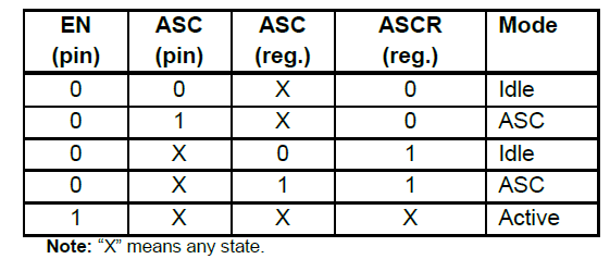 组合1:EN,ASC引脚接地,寄存器ASCR=1,控制ASC实现空闲模式/自动周期模式切换