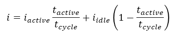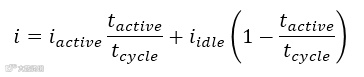 可通过下面公式估算周期损耗,其中正常工作电流iactive为10mA,空闲模式电流iidle为1uA: