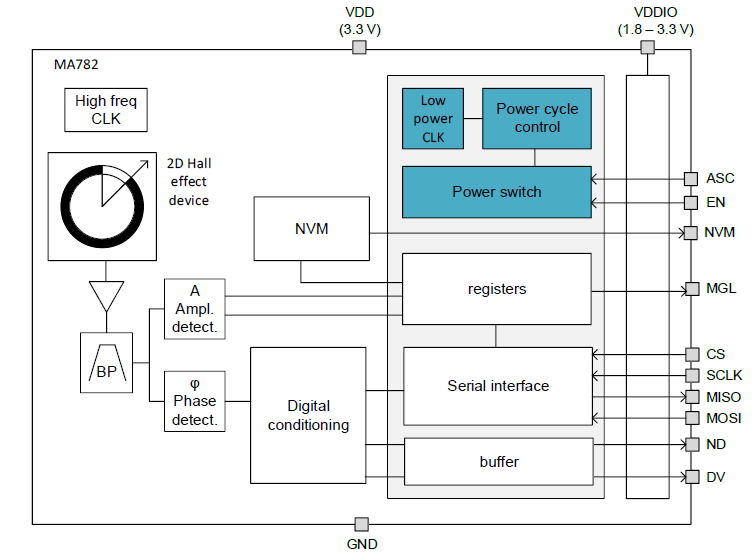 下面,我们主要聊一聊面向电池供电及相关低功耗应用的MA700系列的新产品 --- MA782,它兼顾了MA700系列产品的诸多优点,同时还有两个特别的亮点,就是QFN(2X2mm)超小封装和空闲模式下只有1uA的超低功耗。