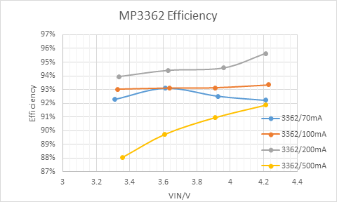 MPQ3362/63针对效率进行了改善,将Rds-on减小到80mOhm。 同时可调节的开关频率,也为各种SPEC的效率优化提供空间。