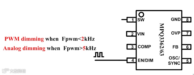 图注:MPQ3362/63在同一个管脚可选择性地实现 PWM和Analog调光
