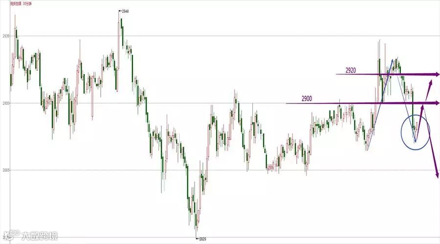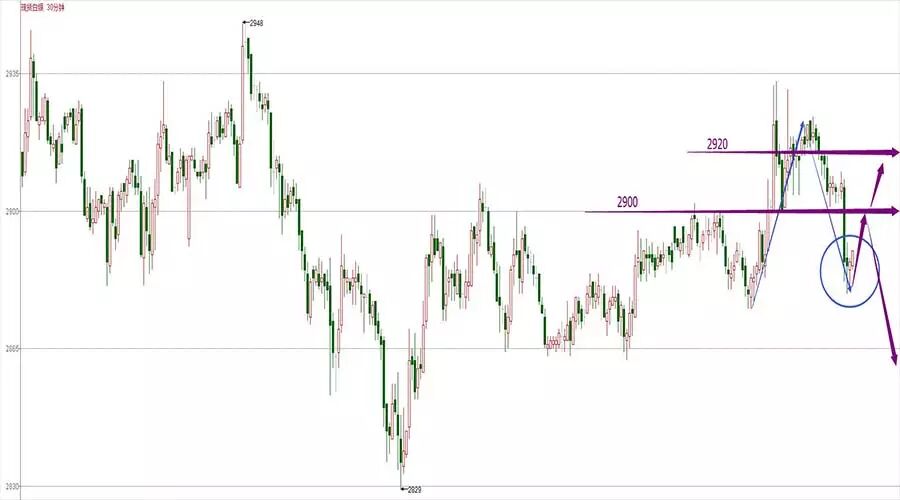 下图是现货白银30分钟K线图,现在银价在2885附近有企稳迹象,后且看反弹高度。