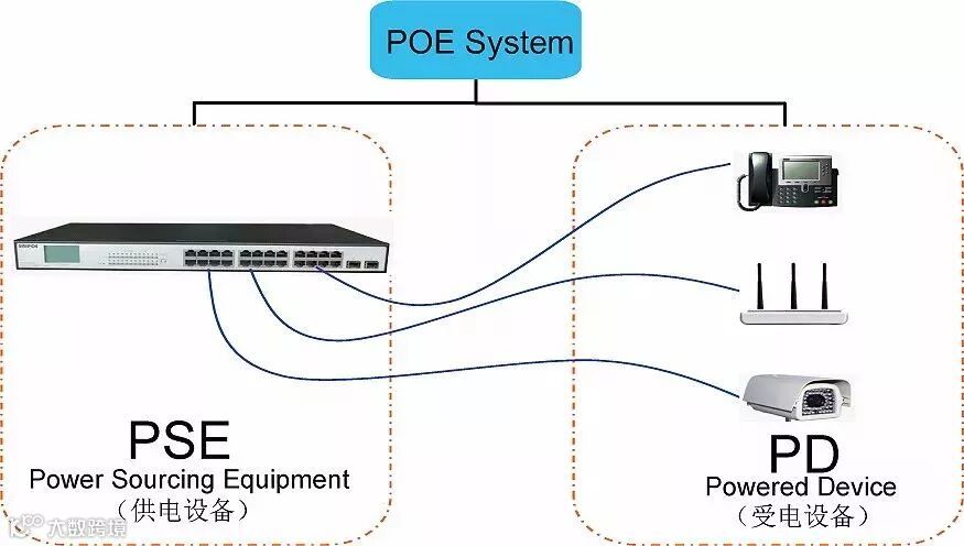 PoE系统包括两部分,供电设备(PSE)和受电设备(PD),PoE供电过程需PD跟PSE通过沟通握手成功后,PSE才能会给设备供48V的直流电。