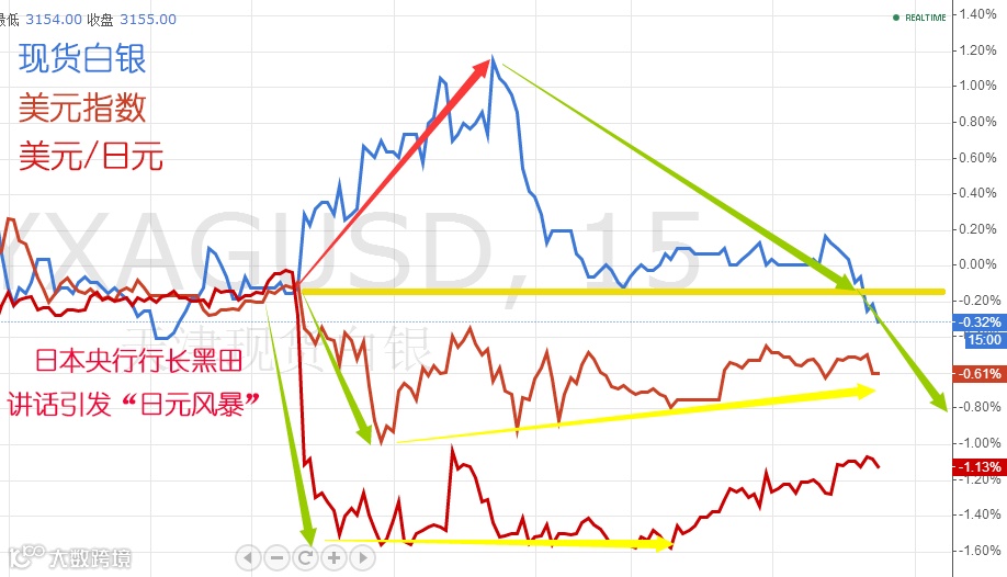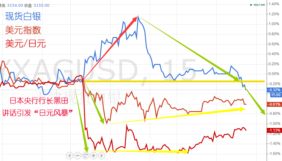 周三,继“欧元风暴”后,日元也爆发了。日本央行行长黑田祭出“口头干预”绝技,力挺日元升值,导致美元兑日元汇率瞬间直线跳水,美指震荡走低,而现货白银却在短暂的上涨后扭头继续下跌,并且下跌幅度甚至高出上涨幅度,溜达了一圈又回来了,两度上涨良机,均无功而返。