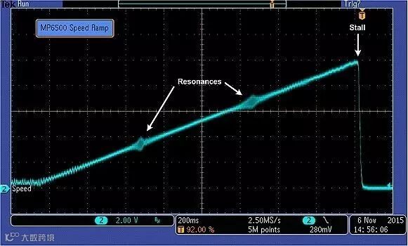 使用相同的设置和绕组电流,如图10所示,由于更好的自适应电流调节控制方案,MP6500可以驱动明显更高的速度。失速发生时,速度测量结果是在10V左右,相当于在600RPM。