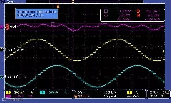 MPS公司的MP6500步进驱动集成芯片,采用内部电流采样和上述的自动衰减电流调节方案,可以实现更好的电机运行质量。如图8所示,速度变化虽不是和模拟正弦和余弦波电流驱动的结果一样小,但是比传统的驱动方案要改善许多,使得电机运行更平稳安静,定位更精确。