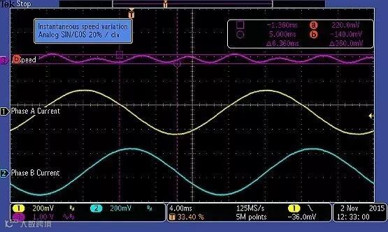 为了检测整个测试系统的运行和了解所用电机和测试装置的固有缺陷,在电机两个线圈上加上相位差90度的正弦波电流。两相电流和代表电机转速的电压信号,如图6所示。